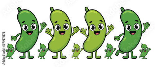 Fototapeta premium Happy cartoon green beans with smiling faces and waving hands in a row