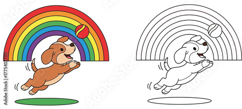 Fototapeta premium Happy Cartoon Puppy Leaping for a Ball Under a Vibrant Rainbow - Coloring Page