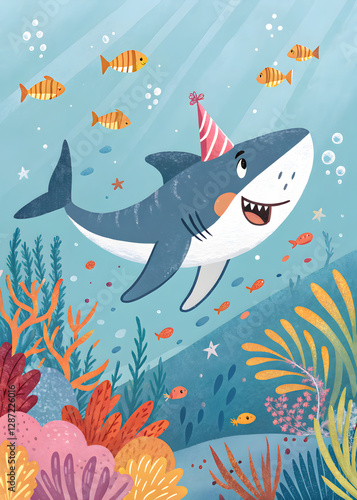 © anastasia_7em, Obraz premium happy cartoon shark in the party hat birthday greeting card with balloons