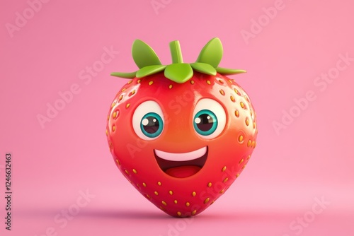 © Nico, Obraz premium Happy Cartoon Strawberry Character with Big Eyes and Smiling Face on Pink Background