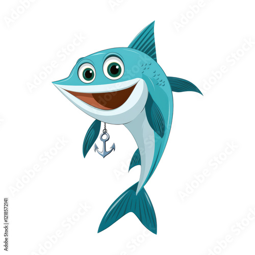 © Enjoy, Obraz premium Happy cartoon swordfish with big smile holding tiny anchor, expressing joy