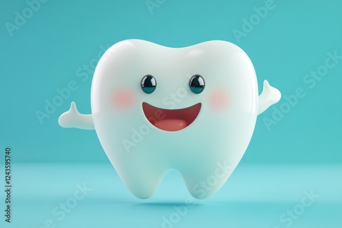 © Nico, Obraz premium Happy Cartoon Tooth Character with Cute Smile and Friendly Expression on a Light Blue Background