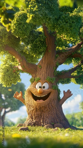 Fototapeta premium Happy Cartoon Tree Character In Sunny Meadow