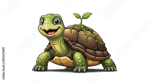Fototapeta premium Happy Cartoon Turtle with Green Sprout.