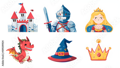 © Nelly, Fototapeta premium Happy Castle, Knight with a Grin, Smiling Princess, Playful Dragon, Cheerful Wizard Hat, Winking Crown