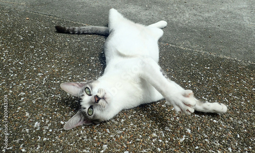 © Uliana, Fototapeta premium Happy cat lying on the pavement up belly