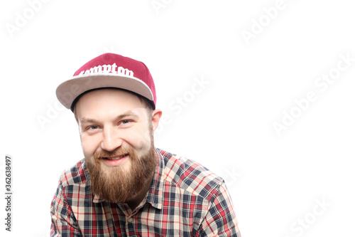 Fototapeta premium Happy caucasian bearded man in checkered shirt and in red cap isolated on...