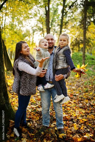 Fototapeta premium Happy caucasian family of mom dad and little girl with boy at majestic autumn...