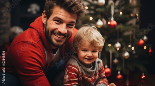 © duyina1990, Obraz premium Happy caucasian father and son near Christmas tree