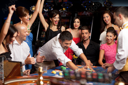 © Daco, Fototapeta premium happy caucasian friends playing roulette in casino