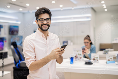 © Dusan Petkovic, Obraz premium Happy Caucasian man holding new smart phone in hands. New technologies concept.