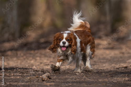 Obraz premium Happy Cavalier King Charles Spaniel Running and Playing in the Muddy Park