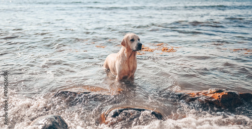 © Алина Троева, Obraz premium Happy cheerful golden retriever swimming running jumping plays with water on the sea coast in summer.