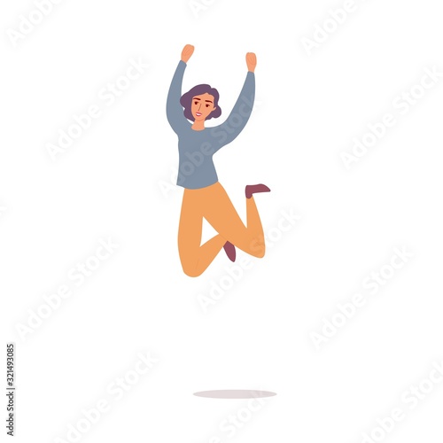 © Kudryavtsev, Fototapeta premium Happy cheerful woman jumping high, flat cartoon vector illustration isolated.