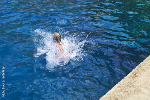 © Petr Bonek, Obraz premium Happy child boy jumping into the blue sea