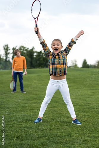 Obraz premium Happy child holding badminton racquet and triumphing while sibling standing behind