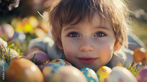 Fototapeta premium Happy child lying on grass surrounded by colorful easter eggs, enjoying a...