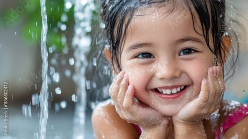 Obraz premium Happy Child Playing in Water with Bright Smile and Joyful Expression