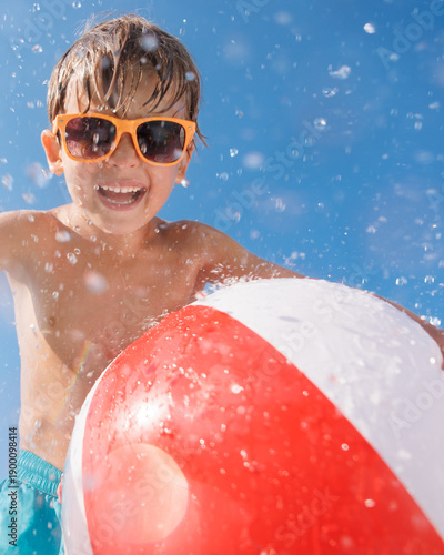 Fototapeta premium Happy child playing in waterpark. Kid having fun on summer vacation
