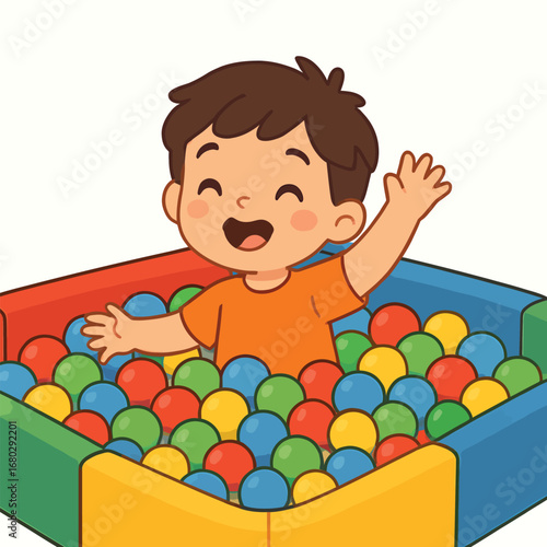 © Ramu888, Fototapeta premium Happy child smiling in indoor ball pool, cute pastel flat cartoon design