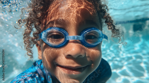 © Lxyzuu, Fototapeta premium Happy Child Swimming Underwater, Light Reflections Dancing on Face, Wearing Goggles