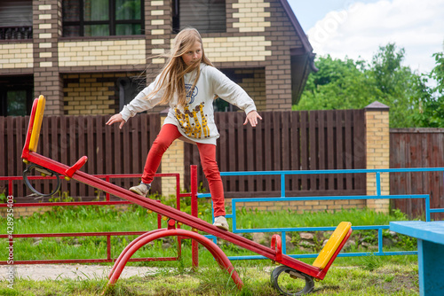 © Ekaterina, Fototapeta premium Happy childhood. Children on the playground, swing, selective focus