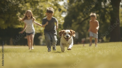 © BerkahStock, Obraz premium Happy children and dog running in park. (1)
