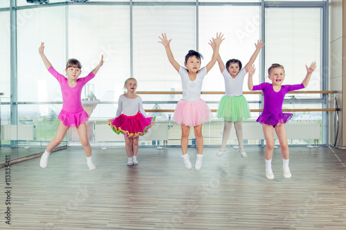 © satyrenko, Naklejka premium happy children dancing on in hall, healthy life, kid's togetherness and happiness concept
