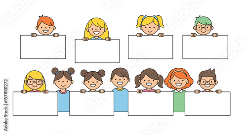 © Dawid, Fototapeta premium Happy children holding blank signs for text and messages kids displaying empty boards cheerful youngsters presenting information