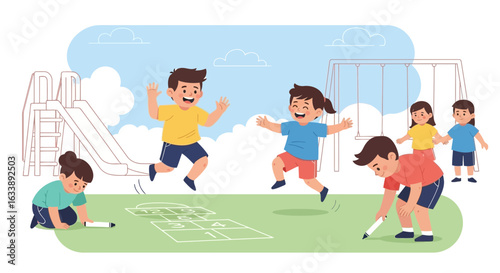 Fototapeta premium Happy Children Playing Hopscotch Together on the Playground Outdoors Illustration