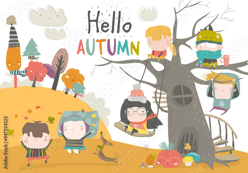 Fototapeta premium Happy children playing in autumn park. Hello autumn