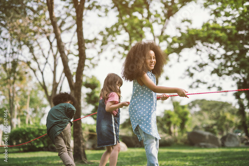 © saksit, Fototapeta premium Happy children playing tug of war at the park