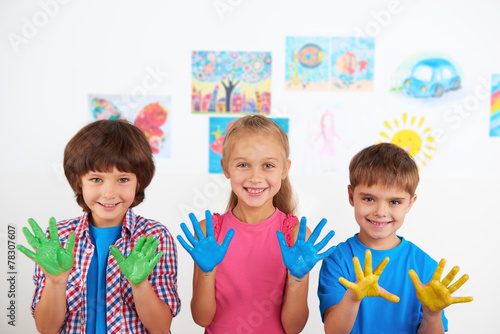 © Friends Stock, Fototapeta premium Happy children showing painted hands