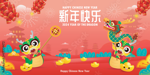 Fototapeta premium Happy Chinese new year 2024 and little dragon in year of the dragon zodiac...