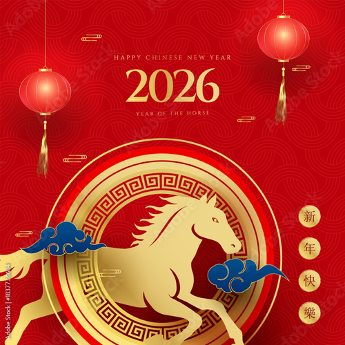 © King Designz, Naklejka premium Happy chinese new year 2026 background, for greeting card or banner. Chinese New Year 2026 – Year of the Horse. Translation : Happy new year.