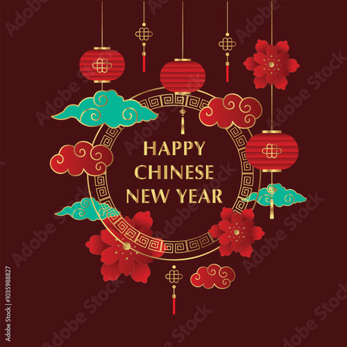 © MdHasan, Naklejka premium Happy Chinese new year background vector. Year of the dragon design wallpaper with Chinese hanging lantern, gold texture. Modern luxury oriental