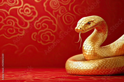 © Prime Lens, Fototapeta premium Happy Chinese New Year 3D Golden Snake Design With Text Space On Red Background