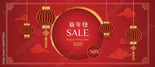 Naklejka premium Happy Chinese New Year 2025. . sale, discount horizontal web banner, lantern...