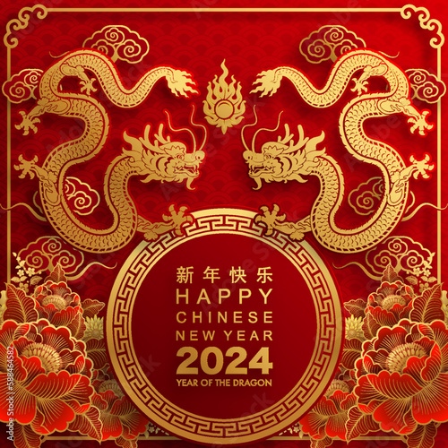 © Siam Vector, Obraz premium Happy chinese new year 2024 the dragon zodiac sign with flower,lantern,asian elements gold paper cut style on color background. ( Translation : happy new year 2024 year of the dragon )
