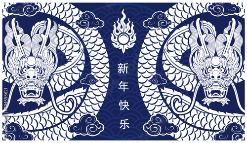 © Siam Vector, Fototapeta premium Happy chinese new year 2024 the dragon zodiac sign with flower,lantern,asian elements white and blue paper cut style on color background. ( Translation : happy new year 2024 year of the dragon )