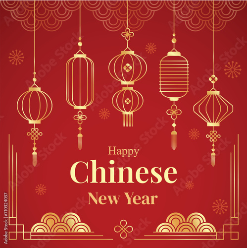 © Thitiyakorn, Naklejka premium Happy Chinese New Year vector, Year of the Dragon banner template design on a gradient red background, gold hanging lantern. Modern luxury oriental illustration for cover, banner, website.