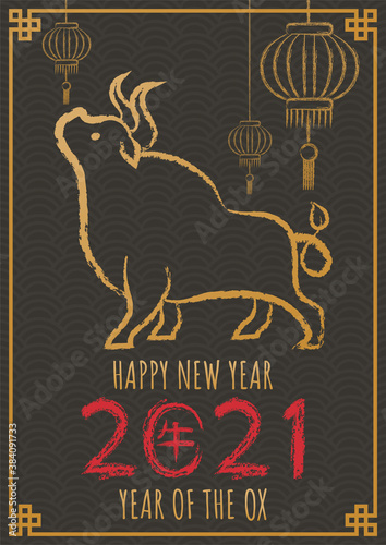 Fototapeta premium Happy chinese new year 2021, Year of the ox. Hand drawn Calligraphy Ox....