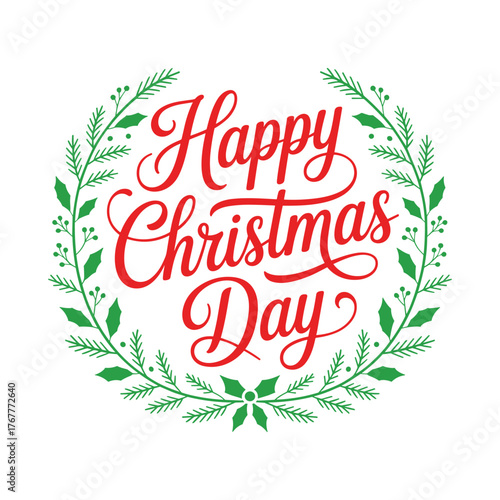 Obraz premium Happy Christmas Day Lettering with Festive Green Wreath and Decorative Elements