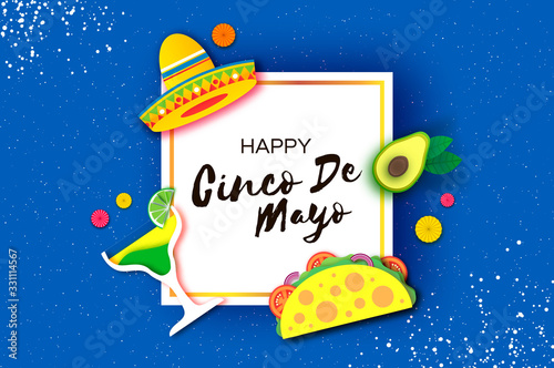 © masherdraws, Fototapeta premium Happy Cinco de Mayo Banner. Sombrero hat, fan, tacos. Coctail. Mexico, Carnival. Square frame. Space for text Blue background