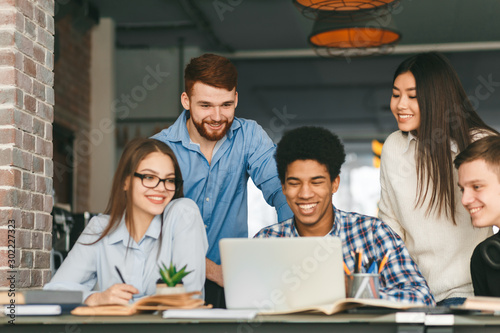 Obraz premium Happy classmates discussing project at library, using laptop