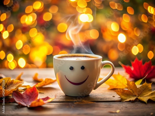 Obraz premium Happy Coffee Cup Bokeh - Warm Drink, Smiling Mug, Cozy Morning, Autumn Vibes,...