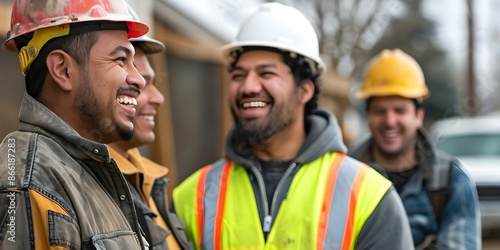 © Anastasiia, Obraz premium Happy construction crew laughing together at work site. Concept Construction Worker Morale, Team Bonding, Workplace Happiness
