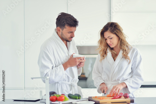 Fototapeta premium Happy couple cooking breakfast together in the kitchen