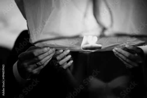 © Tobica, Fototapeta premium Happy couple holding paper lanters.