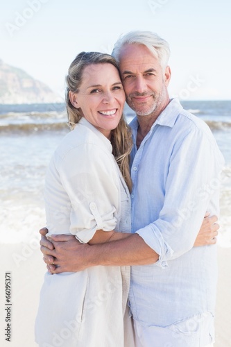 Obraz premium Happy couple hugging on the beach looking at camera